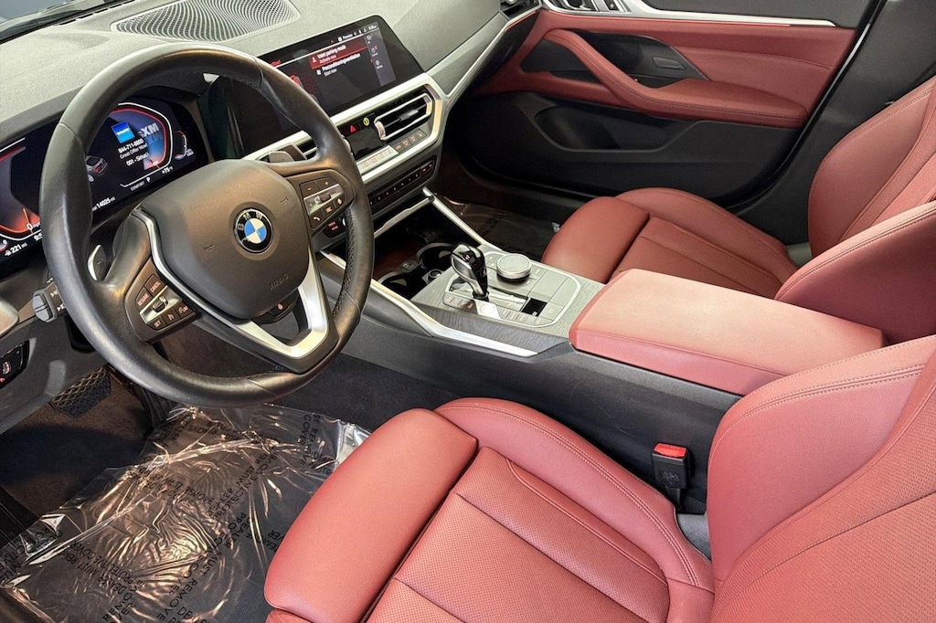 This 2023 BMW 4 Series 430i is a One Owner vehicle with a Clean Carfax, exterior, and interior. Key features include PREMIUM PACKAGE, OPEN PORE FINE WOOD OAK GRAIN TRIM, SHADOWLINE EXTERIOR TRIM, TACORA RED PERFORATED SENSATEC UPHOLSTERY, HEATED FRONT SEATS, PARKING ASSISTANCE PACKAGE, HEATED STEERING WHEEL, AMBIENT LIGHTING, Sun/Moonroof, and much more!